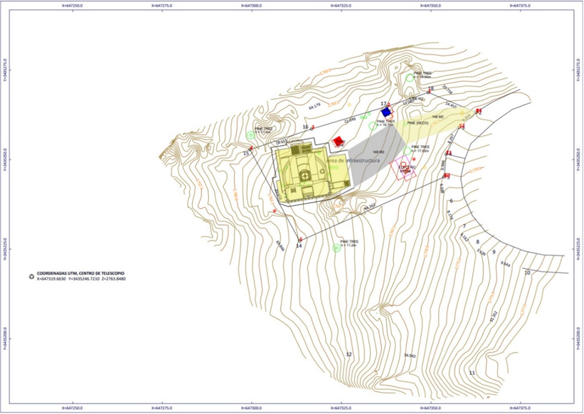 The planned site is within the National Astronomical Observatory of Mexico (San Pedro Mártir, SPM) at coordinates 31° 02′ 41.52″ N / 115° 27′ 52.13″ W, with an altitude of approximately 2,830 meters. The site is above the atmospheric inversion layer and features a dry, stable climate with excellent observing conditions, allowing for an average of 300 observable nights per year.